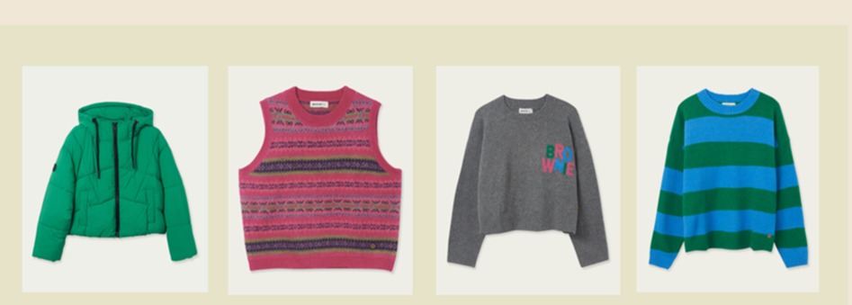 Composta por casacos coloridos, cardigans, camisas e camisolas com logótipos, encontrará também todos os acessórios essenciais de inverno nos mesmos tons vivos.