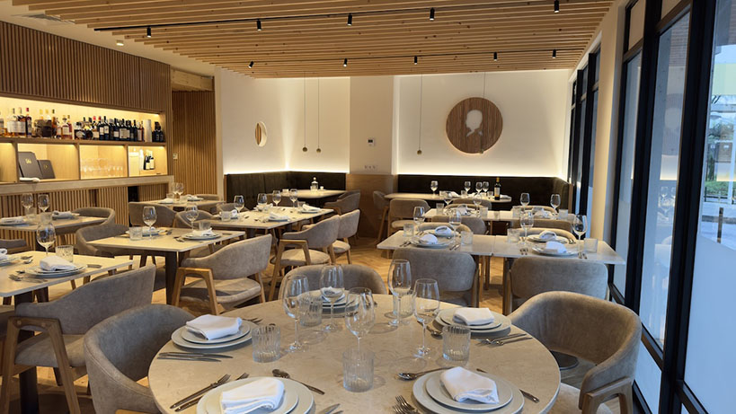 A nova decoração exibe elegância em todos os detalhes, recorrendo à sofisticação dos tons escuros com apontamentos de cor, numa paleta entre os azuis e os esverdeados, tanto nos elementos que compõem o table setting como na iluminação dinâmica que preenche a sala. Os materiais ecológicos oscilam entre a leveza das mesas em madeira, conjugadas com apoios metálicos, e as cadeiras em veludo, uma textura clássica aplicada em linhas contemporâneas que confere uma vibe cool ao melhor estilo avant-garde. Uma decoração inovadora que responde às tendências atuais do design de interiores.