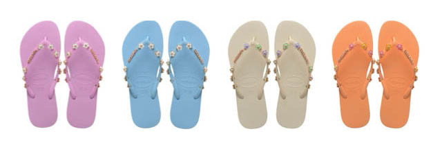 As Havaianas Slim Stylish que, tal como o nome indica, prometem dar uma grande dose de estilo a qualquer look. Com as tradicionais tiras finas, este modelo para mulher junta duas tendências, segundo a Havaianas: o floral e as tachas. Resultado: uns chinelos super fofos com várias tachas de flores que adornam as tiras — tudo isto num modelo monocromático em tons pastel. Existem opções com flores coloridas ou todas brancas.