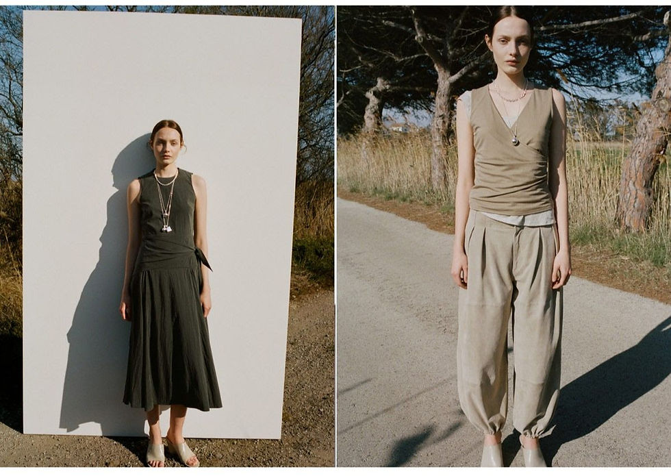 Os tons castanhos e verdes dominam a proposta, que inclui parkas, macacões, vestidos e calças fluidas, criando um guarda-roupa versátil e ideal para a primavera.