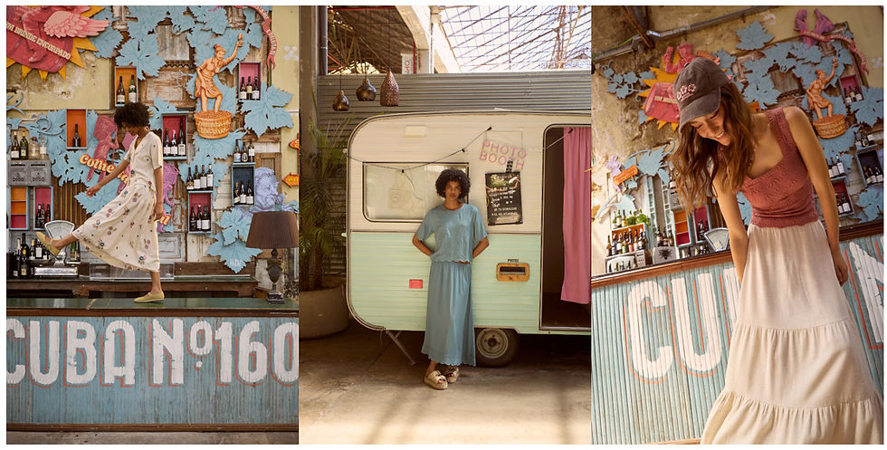 A coleção inclui vestidos, tops, calças flare e conjuntos às riscas ou com motivos florais, pensados para criar looks versáteis e cheios de personalidade. Os acessórios em croché, como malas multicolor, reforçam o estilo boémio da linha.
