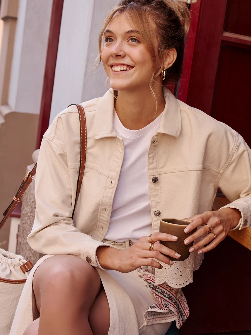 Com uma paleta de tons suaves como o creme, o verde sálvia e o rosa pó, cada peça reflete frescor e versatilidade, ideal para a estação. As jaquetas jeans bordadas trazem um toque romântico e descontraído, enquanto as saias midi e as calças relaxadas garantem conforto sem abrir mão da elegância. Acessórios como lenços estampados e tênis de lona adicionam dinamismo a cada look, permitindo brincar com as combinações e expressar a personalidade de cada um.