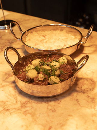 Bamia bil Lahmeh: estufado de vaca com cenoura, especiarias, arroz libanês, sultanas e amêndoas tostadas