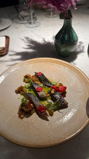 — Entrada: Cavala, Vinagrete de Alcachofra, Pinhão, Azeitona e Tomate Confitado