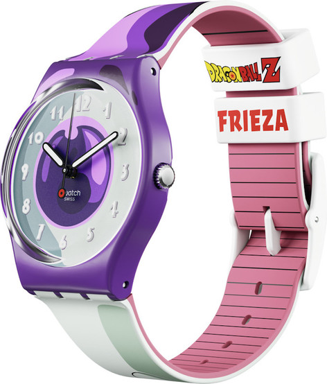 A Swatch considera os seus relógios como guardadores de memórias e dá o seu toque colorido, divertido e inovador ao Dragon Ball Z. Há duas versões ou elementos da mesma personagem na frente e no verso de cada relógio.